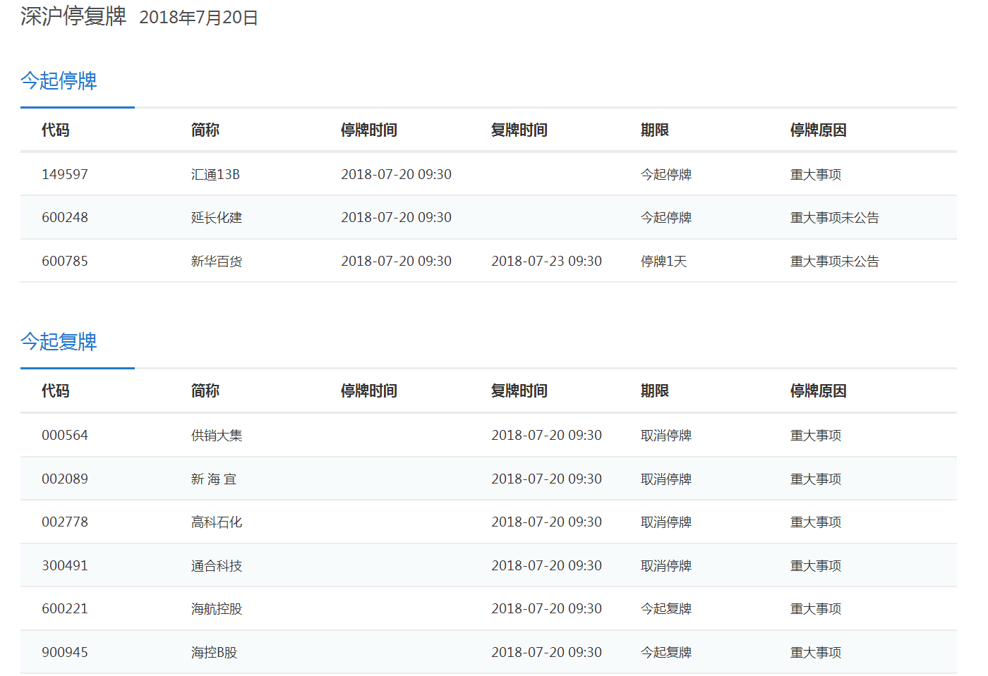 7月20日停复牌汇总
